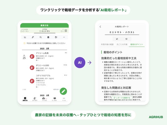 アグリハブは、現役農家が開発している農家向け栽培管理アプリです。快適な操作性とわかりやすいUIはユーザーから高い評価を得ており、現在4万人を超えるユーザーに利用されています。この度、アグリハブに新たな機能「AI栽培レポート」が追加され、日々アプリ内に記録している作業データをもとにワンクリックで栽培レポートを作成できるようになりました。本機能はアグリハブのスターター・プレミアム会員の方がご利用いただけます。
