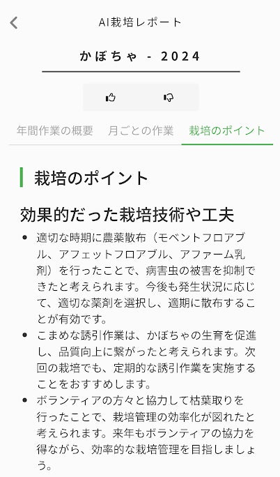 そこでアプリ内にAIの自動分析機能を搭載することで、作物に対してこれまで行った作業を振り返り、未来の栽培計画に活かせるレポートを作成する「AI栽培レポート」が生まれました。AIによる自動要約機能により、デジタルでの作業記録から重要ポイントを抽出し、農家が次のシーズンに活かせる洞察を提供します。