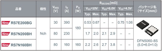 新製品は、企業向け高性能サーバーに用いられる12V系統電源のAC-DC変換回路の二次側およびホットスワップコントローラ(HSC)(*4)回路に最適な「RS7E200BG(30V)」と、AIサーバーに用いられる48V系統電源のAC-DC変換回路の二次側に最適な「RS7N200BH(80V)」「RS7N160BH(80V)」の計3機種です。