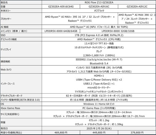 ASUS JAPAN株式会社は、新たなチップレットデザインで設計された最新のAMD Ryzen(TM) AI MAX+395プロセッサー、または、AMD Ryzen(TM) AI MAX 390プロセッサーを搭載し、圧倒的なグラフィックパフォーマンスを実現した、キーボード部分を脱着できるCopilot+ PC準拠の2-in-1ゲーミングノートPC「ROG Flow Z13 GZ302EA」を発表いたしました。本日2月26日(水)より発売開始となります。