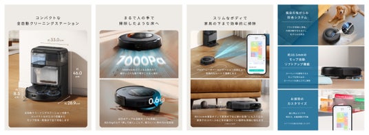 本製品はソファやベッド等の家具の下に入り込み、隈なく掃除ができる約8.5cmの高さのスリムな掃除機本体と「Eufy X10 Pro Omni」と比較して約46%小型化(※1)したステーション、両方ともコンパクトな設計のため設置場所を選ばずに導入がしやすいことが特徴。コンパクトながら満足できる機能性も魅力で、7000Paの強力な吸引掃除に加えて、加圧式デュアル回転モップを搭載し雑巾がけのように「押して拭く」水拭き掃除が可能です。また、リアルタイムで部屋の形を認識してマップを作成し、複雑な間取りでも漏れなく効率的な経路を作成して掃除するAnker独自のiPath(TM) レーザー・ナビゲーションも搭載しています。ステーションはゴミの収集だけでなくモップの洗浄、乾燥までを全自動で行う他、毛がらみ除去システムも搭載するため、掃除の手間を大きく減らすことができます。多機能ながら手に届きやすい価格帯で設置しやすいコンパクト設計のため、新生活をスマートに過ごせるロボット掃除機をお探しの方や、単身世帯や1~2人のミニマルな暮らしの方に最適です。