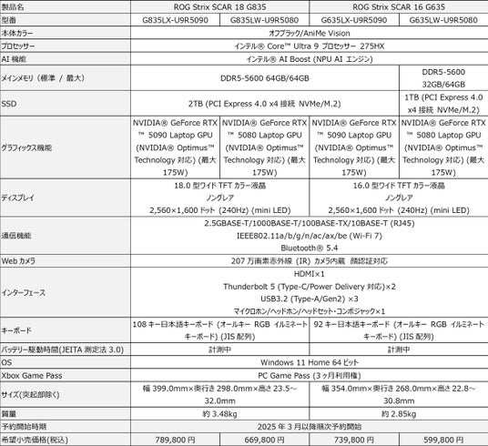 ASUS JAPAN株式会社は、ASUSのゲーミングブランド「Republic of Gamers(ROG)」より、圧倒的なグラフィックパフォーマンスを誇る新しいGPU、NVIDIA(R) GeForce RTX(TM) 5090 Laptop GPU、または、NVIDIA(R) GeForce RTX(TM) 5080 Laptop GPUを搭載した、ハイパフォーマンスゲーミングノートPC「ROG Strix SCAR 18 G835シリーズ」および「ROG Strix SCAR 16 G635シリーズ」と、薄型軽量でスタイリッシュなプレミアムゲーミングノートPC「ROG Zephyrus G16 GU605シリーズ」を3製品6モデル発表いたしました。2025年3月以降順次予約開始となります。