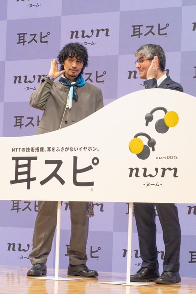 発表会ではNTTソノリティの坂井博社長が登壇して、周囲と共存できるオープンイヤー型イヤホンのコンセプトやnwmの独自技術について改めて紹介した。また、本製品の発売に合わせて、俳優の斎藤工さんをアンバサダーに迎えたCMなども制作。その内容も披露された。内容はnwm GOを含む、既存のnwm製品4機種を擬人化したバンドメンバーによる"4人組ハード?ロックバンド「MIMISPI」"のメンバーを斎藤さんが演じて、それぞれの個性が際立った製品の魅力を伝えるもの。