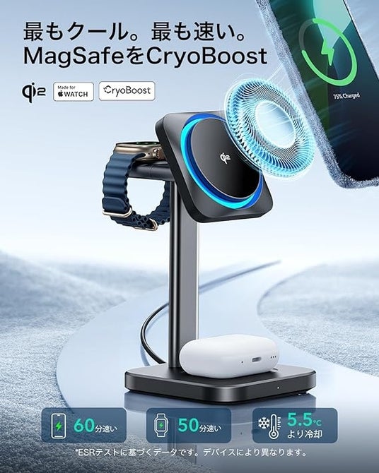 Amazon:ESR Qi2 3-in-1ワイヤレス充電ステーション CryoBoost(HaloLock)