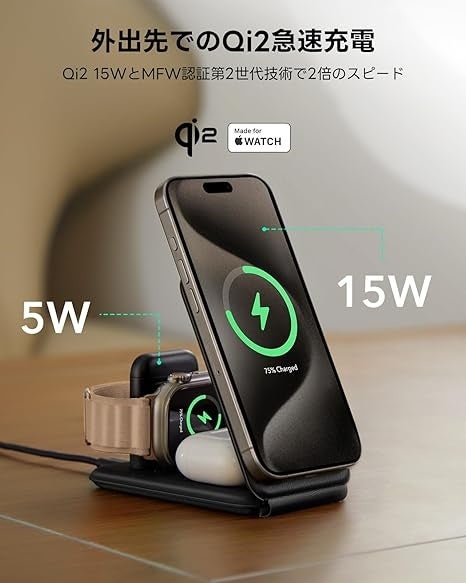 ESR Qi2 3-in-1トラベルワイヤレス充電セット(HaloLock)は、Apple公式Qi2認証のため全iOSおよびwatchOSのアップデードに対応しており、AirPods、iPhone(15W)、Apple Watch(5W)の3デバイスを同時に途中で自動停止することなく安全かつ早く、信頼性の高いワイヤレス充電することが出来ます。また、縦向き・横向きのお好みに合わせiPhoneを磁気吸着させながら充電を行え、そのままビデオ通話や動画鑑賞を快適に楽しむことが出来ます。移動時には2つ折りにしてコンパクトに持ち運ぶことが出来ます。