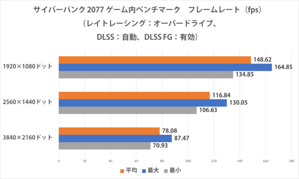 1本目はサイバーパンク 2077から。ゲーム内ベンチマークを用いてフレームレートを測定した。画質設定はクイックプリセットから「レイトレーシング:オーバードライブ」を選択。パストレーシングも使用する一番高画質かつ一番重たいプリセットだ。DLSSのフレーム生成も有効にしている。