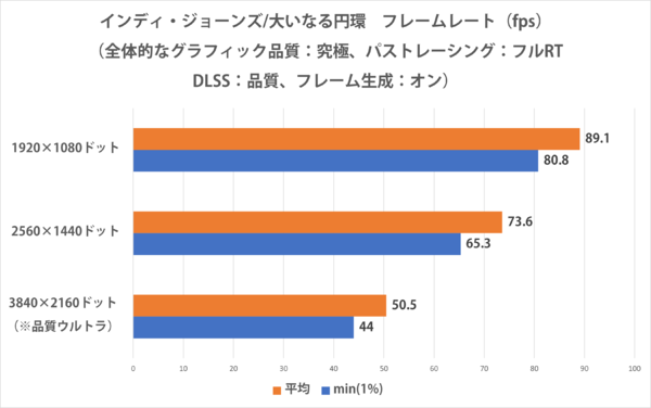 4Kになると100fps超えといった高フレームレートは厳しくなるが、最小フレームレートが約70fpsで、全編通して60fps以上を安定的に維持できていることを示している。4Kの場合はフレームレート60fps固定での安定プレイがオススメだ。
