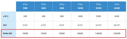 従来は4GB~64GBのプランにおいて、一律100GBの容量を提供していましたが、今回の強化によりディスク容量を最大2,400GBまで拡大しました。