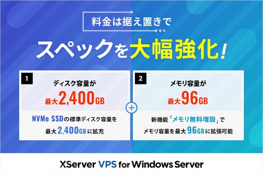 エックスサーバー株式会社(所在地:大阪市北区、代表取締役:小林 尚希)は、2025年2月26日、サーバー性能とコストパフォーマンスでNo.1(※1)を誇る『XServer VPS』において実施した大幅なスペック強化を、Windows搭載プラン『XServer VPS for Windows Server』にも適用しました。今回の強化により、4GBプラン以上で一律100GBだったNVMe SSDのディスク容量を最大2,400GBまで拡大。さらに8GBプラン以上では、メモリ容量を無料で1.5倍に増設できる「メモリ無料増設」機能を新たに追加し、これまで以上に高いスペックが求められる環境や、幅広い用途への対応が可能になりました。なお全プランの料金は据え置きのため、現在『XServer VPS for Windows Server』をご利用中のお客様も、強化後のスペックを現行価格のままご利用いただけます。
