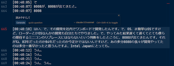 CURSORで、私がいちばんよく使う機能の1つは、1つの段落なり1つの章なりをまとめてAI的に書き直してもらうことだ。直したい部分を「選択」をしたあとに「Ctrl-K」とやって、この部分に対して指示を出す。