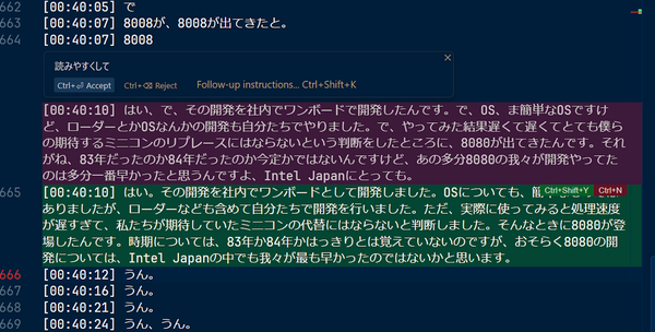 ここで、「Accept」とか「Reject」をキーボードショートカットかマウスで選んでやればよい。もちろん、気に入らないならプロンプトを書き換えてやり直すのもありだ。同じようなことは、ChatGPTでもワープロ画面からカットペーストしてできるが、それは手間というものだ。ファイルをアップロードして文章全体を書き換えてもらうことも可能ではあるが、なんとも大ざっぱな作業となる。
