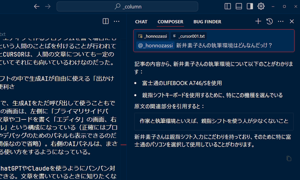 というわけで、CURSORとは、文章を書くときにどんなふうに使えるのか? まだ触っていない人もいると思うので、「こんなところが便利だよ」というところを、いくつか見ていただくことにしよう。