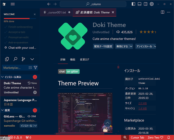画面の色やデザインなどは、自分で設定できるほかにテーマとして提供されている。私の場合はオタクムード漂う「Doki」というテーマをインストールして使っている。カスタマイズ機能は、あまりに豊富なので、なにがなんだか分らなくなりそうになるが、それら、設定方法もAIパネルに「この設定を変更したいのですが」と質問すれば教えてくれるというのが、なかなか新しい体験となる。