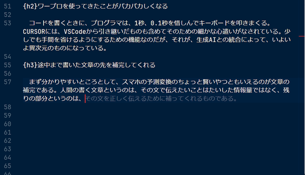 これは、まだ非常に単純な例で何行にもわたる「文章を提案」してくることもある。なので、ちょっとした原稿を書くときに最初の「ひとこと」を書いたら、あとはCURSORが全部書いてくれるようなことが起きてしまいそうになる。実際に、後述するメンション機能などで適切なリソースを与えてやるとそれに近いことは可能かもしれない。