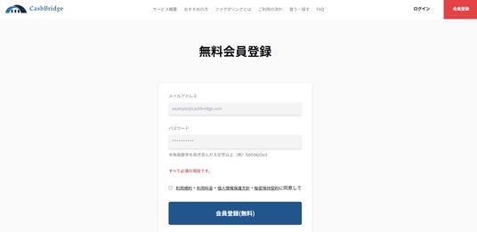 テスト版の利用を希望される方は、Cash Bridgeのサイト上で無料会員登録を行うことでサービスをご利用いただけます。
