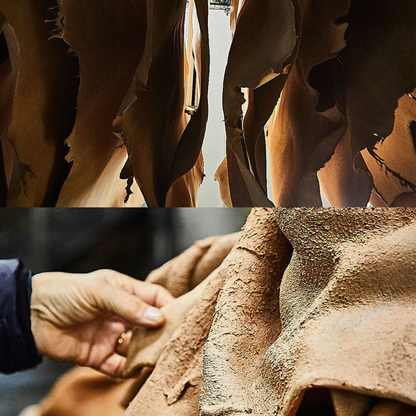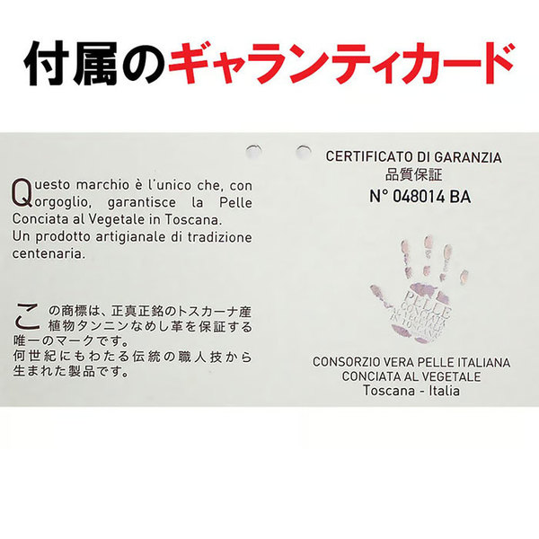 この製品は、イタリア有数の革の産地であるサンタクローチェ地方のガビアーノ社製レザーを使用しています。化学薬品を使用せず、環境に優しい方法で製造されたベジタブルタンニングレザーは、革本来のシワやシボが自然な風合いを引き立てます。
