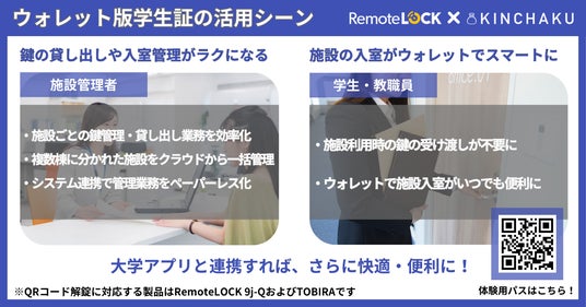 大学や専門学校のセキュリティと利便性を向上させる革新的なソリューションが登場します。株式会社構造計画研究所(以下:構造計画研究所)および株式会社KINCHAKUは、ビジネスのためのスマートロック「RemoteLOCK」とデジタルパス「KINCHAKU」を組み合わせ、ウォレットアプリを活用した入室管理の提案を開始します。