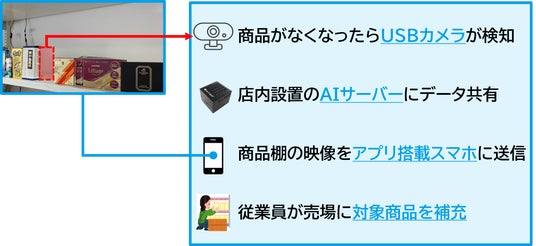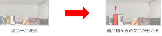 「AIガードマン(R)マスター」は、一列だけの現品陳列が行われている商品棚を、常に「AI棚管理システム」で管理し、上記商品棚において欠品が生じた場合に、リアルタイムで店員に当該欠品情報(商品棚の映像)を通知します。これにより、一列だけの現品陳列が行われている商品棚においてもタイムリーで適切な商品補充が可能となり現品が常に商品棚に置かれている状態を保って、「1品置き」としたことに起因する「販売機会ロス」も確実に防止することができます。
