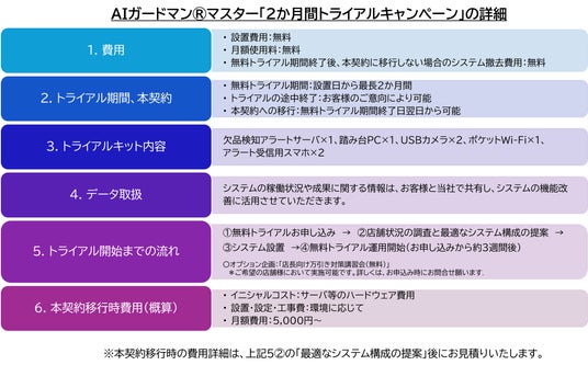 本日より、「AIガードマン(R)マスター」について、「2か月間無料トライアル」の受付を開始いたします。本キャンペーンでは、2か月間、トライアル期間として「AIガードマン(R)マスター」を受付期間中にお申込みいただいた先着5店舗に無料でご利用いただき、トライアル期間終了後、継続的に使用いただくかどうかをご判断いただくものです。当社はAIソリューション開発のフロントランナーとして、技術とサービスにつきましては確たる自信がありますが、特にAIカメラを導入したことのない店舗の方々等、AIシステムの導入に漠然としたご不安をお持ちのお客様にも当社の技術力を体感していただけるように企画させていただきましたキャンペーンです。この機会に是非お早めに、下記までお問合せ願います。
