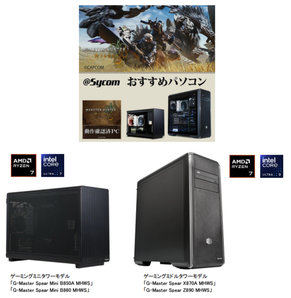 サイコムは2月28日、自社の人気ゲーミングモデル「G-Master Spearシリーズ」の新たなラインナップを発表した。これらは「モンスターハンターワイルズ動作確認済PC」として、本日より販売が開始され、それぞれのモデルは「G-Master Spear Mini B850A MHWS」「G-Master Spear Mini B860 MHWS」「G-Master Spear X870A MHWS」「G-Master Spear Z890 MHWS」の4機種だ。