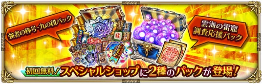 スペシャルショップにて、「開幕!クラウド・レルム対抗戦 SS1体確定サガ魂ガチャチケット[期間限定]」が含まれた、「強者の称号・九の段パック」や「雲海の雷窟調査応援パック」を販売します。