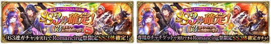 本ガチャでは、通常ガチャと「集めて実行!SS3体確定!63連ガチャ Romancing祭チケット[期間限定]」を63枚集めることで実行できるガチャの2種類をご用意しております。