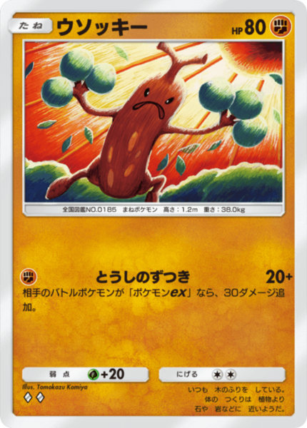 もう1体のスタート時ポケモンの候補として、ウソッキーを採用する手もあります。ウソッキーはたねポケでHPが80と比較的高く、ワザの「とうしのずつき」は、相手がexポケモンであれば、+30ダメージで50ダメージ出すことができますので、ディアルガexなど、エネブースト兼壁役で登場するポケモンに対して強く出られます。