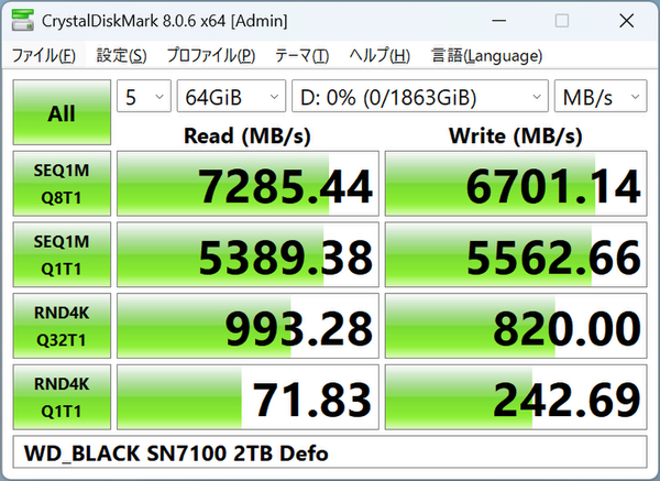 さっそくRyzen 7 9700Xと、AMD X870チップセット採用マザーボードなどで構成したPCに、SN7100を組み込んでそのパフォーマンスを確認していこう。システム用にはWD_BLACK SN850 NVMe SSD 2TBを用意し、計測ストレージは、なにもデータがない状態にしている。