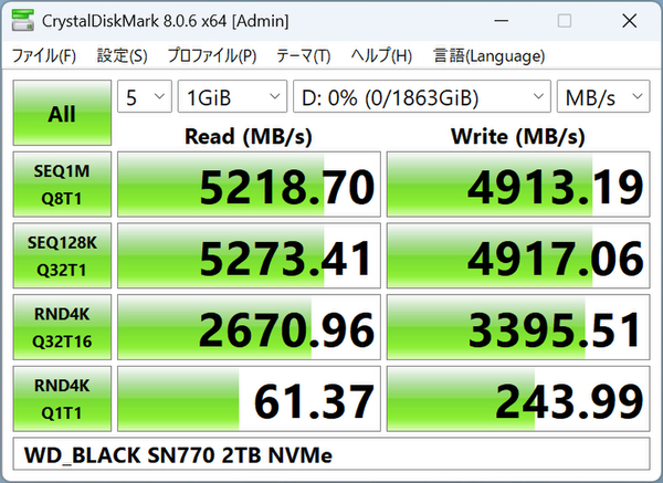 また、64GiB NVMe SSDモードではランダムの「RND4K Q32T16」が、データサイズ1GiBテスト時より2分の1以上ダウンしているのは残念だが、同じ条件でのSN770 2TBや、SN850X 2TBも書き込みは同じようにダウンする傾向にあった。