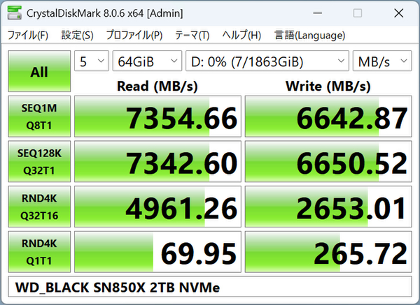 1GiBと64GiBのデータサイズとテストモードに関係なく、連続読み込みは7000MB/秒台を超え、連続書き込みも6600~6900MB/秒台という文句なしのパフォーマンスを発揮している。ランダムも高速で、NVMeモードの「RND4K Q32T16」のIOPSは、公称値を超える読み込み1022746 IOPS、書き込み1404823 IOPSを記録した。連続、ランダムともに、公称値通りのパフォーマンスを発揮していると言える結果だ。