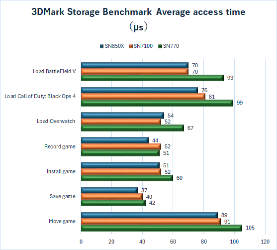 3DMark:Storage Benchmarkは、SN850X 2TBが、わずかな差だが3000台のスコアでハイエンドモデルの地位を守っている。ゲームのロード時間などの各テストでも、おおむねSN7100 2TBを下している。2番手ではあるが、前世代となるSN770 2TBを大きく引き離しているのは、ここまでと同じだ。