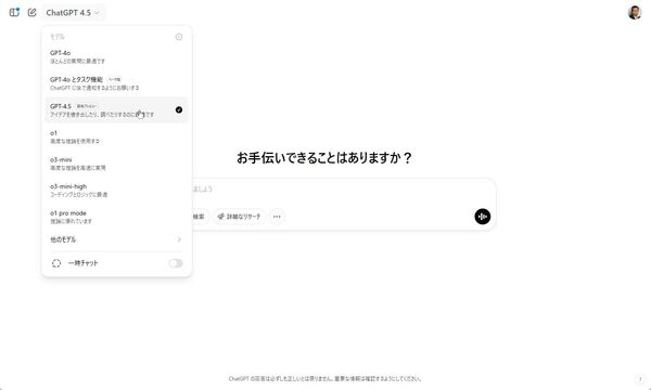 使い方は、いつも通りで、AIモデルの選択メニューから「GPT-4.5」を選べばいい。最新モデルだが、画像や文書ファイルをアップロードしたり、画像を生成させることもできるうえ、検索機能やディープリサーチ機能を最初から使えるのはありがたい。
