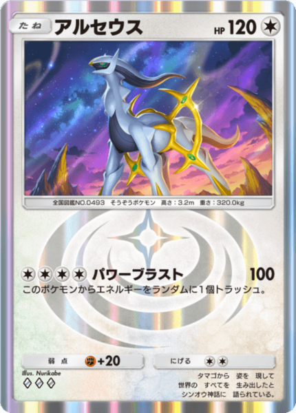 このポケモンの唯一の難点は、逃げエネが3と重いところ。しかし、ベンチにアルセウスかアルセウスexがいれば逃げエネが0になる特性「スピードリンク」を持っていますので、これをデッキに加えることで、ゴウカザルexと入れ替わり立ち替わり攻撃が可能になります。