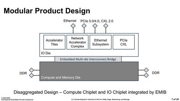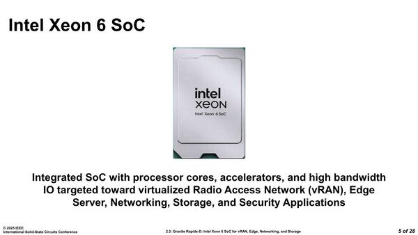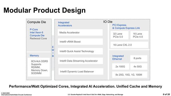 ただ今回の本題はこちらではない。これに加えて今回、Granite Rapids-Dというコード名で知られる、Xeon 6 SoCも12製品発表になった。米国で2月16日から開催されていたISSCC 2025においてインテルは"Granite Rapids-D: Intel Xeon 6 SoC for vRAN, Edge, Networking, and Storage"(Paper 2-3)という発表をしており、この資料を基にこのXeon 6 SoCについてもう少し説明していきたい。