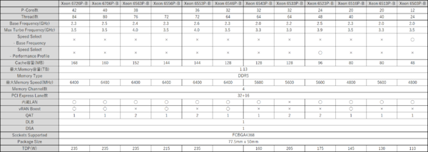 Xeon 6900Pシリーズも含めたSKU一覧はインテルのウェブサイトにあるが、もともと昨年中にXeon 6900Pシリーズは発表されており、今回はこれに追加された形だ。コア数は8コアから86コアまで、メモリーチャネルは8chとなっている。パッケージも全品FCLGA4710(Xeon 6944PのみFCLGA7529)構成である。