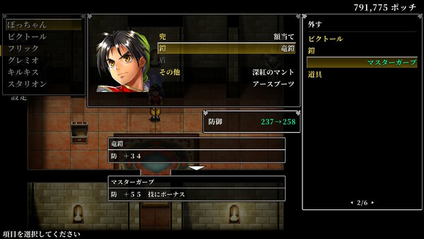 UIは元の仕様を維持しながら見た目をわかりやすく調整。顔イラストが描きおろしで高画質化している点や、装備を「わたす」で移動させず、直接ほかのキャラと交換できるようになったのはとても便利で感動した。