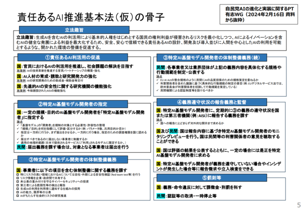どこまで罰則規定を定めていくのかということには、若干の紆余曲折があったようです。自民党のAIプロジェクトチームは、2024年2月に「責任あるAI推進基本法(仮)の骨子」をまとめています。AIの推進色が強い内容であることは間違いないのですが、“特定AI基盤モデル開発者を規定し、体制整備と報告する義務を課す”という内容が含まれていました。これは、OpenAIなどの基盤AIモデルを開発する事業者などに一定の報告義務を課し、大きなトラブル(インシデント)が起きた場合には、報告徴求や立入検査をでき、課徴金・刑罰を科すことを認めるという内容でした。