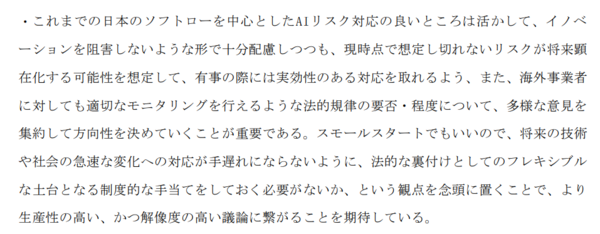 “1つ目は、リスク対応とイノベーション促進の両立です。ガイドラインをベースとしつつ、リスクの大きさに応じて対策を講じ、AIの安全性を確保する必要があります。2点目は、技術・ビジネスの変化の速さに対応できる柔軟な制度の設計です。3点目は、国際的な相互運用性、国際的な指針への準拠です。4点目は、政府によるAIの適正な調達と利用です。政府の取組は、他への波及効果も大きいので、しっかりと検討を進めていきたいと思っています” (「AI戦略会議(第11回)・AI制度研究会(第1回)合同会議 議事要旨」P.10-11)