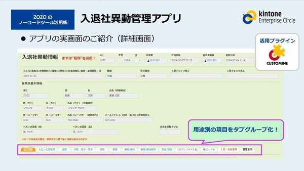 また、kintoneアプリ化することで、一覧だけではなく、個々のデータの詳細も確認できる。入社や休職、異動といった人事イベント毎にタブ分けすることで、必要な情報だけをすぐ確認できるよう工夫もこらした。データの2次活用においても、連携先のシステムに合わせた項目を予め設けることで、出力したcsvをインポートするだけでデータを追加・更新できる。