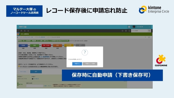 もうひとつは「保存後の申請忘れ防止」だ。こちらもgusuku Customineで、レコード保存時に「このまま申請するか」を尋ねるダイアログボックスを表示。申請するか下書きとして保存するかを選択できるようカスタマイズした。石井氏は、「基本機能に追加してもらっても問題ない」と参加者をわかせ、セッションは終了した。