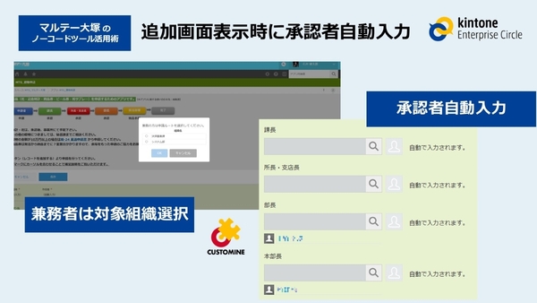 ひとつ目は「承認者の自動入力」だ。申請ルートマスターを別で作り、承認者を選択できるようにする手法でも、ユーザーは誰を選んでよいか迷ってしまう。そこで、細かいkintoneのカスタマイズが可能な「gusuku Customine(アールスリーインスティテュート開発)」を活用。追加画面を表示しただけで、自動ルックアップで事前設定された承認者が自動入力される仕組みを実現したという。