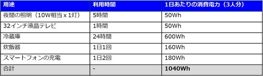 3人家族で1日の停電をやり過ごすためには、以下のように1,040Whの電力が必要です。そのため、停電が3 日間続く場合は、3,000Wh程度のポータブル電源が必要になります。