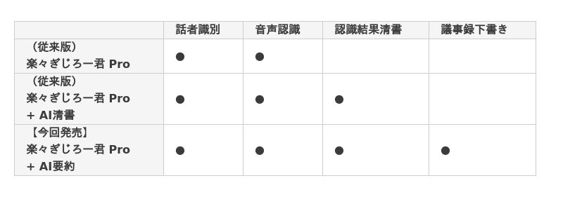 今回発売する「楽々ぎじろー君 Pro + AI要約」は従来版の「楽々ぎじろー君Pro」 や「楽々ぎじろー君Pro + AI清書」の機能を全て包含した上で議事録の下書きまで作成できます。