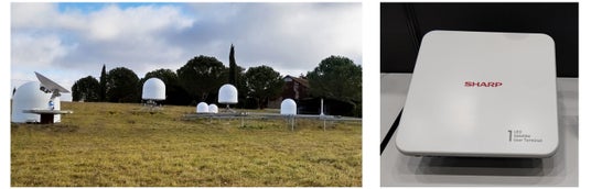 左:実証実験を行った衛星通信試験場(フランス・トゥールーズ)、右:地上局用フラットパネルアンテナ試作機