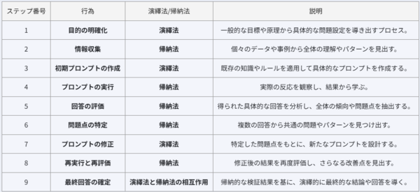 当初着想したとおり、プロンプトを書いて回答を得る営みは、演繹的・帰納的アプローチの両方が関わっていると言えそうです。厳密には、行為の分解の仕方や、各行為に対する演繹的/帰納的の解釈は、人によって異なる部分はあるかもしれません。(例えば、情報収集はせずに、プロンプトを書き出すケースも相当数あると思うので)