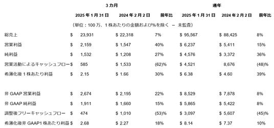 ・2026会計年度第1四半期(2025年2月~2025年4月)の売上高は225億から235億ドル、中間値で前年同期比3%増の230億ドルと予測