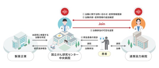 国立がん研究センター中央病院では、臨床試験(治験)組入れの迅速化を目指し、連携協力病院と医療関係者間コミュニケーションアプリ「Join(ジョイン)」を活用し、事前にJoinで臨床試験の適格性を推定し、効率的に臨床試験に参加できるよう実証研究※3を開始します。