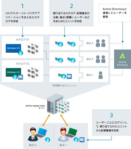 シンクライアントシステム「SKYDIV Desktop Client」は、仮想環境(シンクライアント)でのPCの運用管理を支援する各種機能を搭載し、リモートワークやネットワーク分離環境などのさまざまな業務環境で、安全かつ便利に業務を行っていただけるようにサポート。管理画面上でユーザーへの仮想端末の割り当てや、各端末の利用状況の確認が簡単に行えるよう使いやすさにこだわった設計、画面構成となっています。