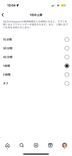 「1日の制限」をタップし、利用時間の上限を15分間、30分間、45分間、1時間、2時間から選ぼう。設定した時間になったら、リマインダーが表示されるので、やめるきっかけになるかもしれない。このとき「オフ」を選ぶと制限されなくなる。