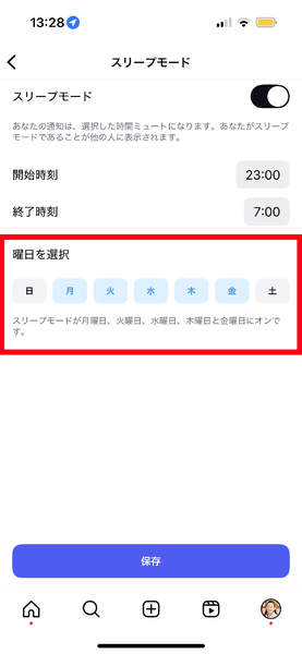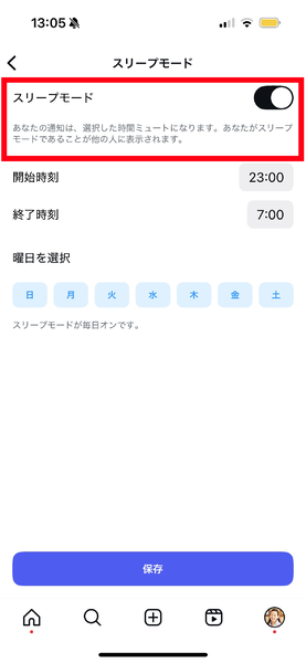 スリープモードで就寝時間を設定しておくと、Instagramを閉じるようにリマインダーが表示される。スリープモードをタップし、スリープモードをオンにしよう。続いて、開始時刻と終了時刻の時刻部分をタップして時間を設定し、「保存」で設定完了だ。
